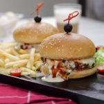 -Toasted burger bun per tayyar cheese sauce,iceberg,cooked beef patty with cheese,cheese sauce aur tomato ketchup dal ker upper sa burger bun rakh dein (makes 5).