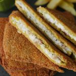 Now coat marinated fish fillets into breadcrumbs then dip into beaten eggs and again coat in breadcrumbs and shape into square shape.