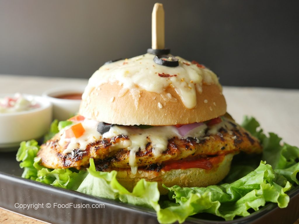 On burger bun,add & spread pizza sauce,place cooked chicken fillet,cheddar cheese,mozzarella cheese, onion,capsicum,tomato,jalapenos,black olives,dried oregano and red chili crushed.