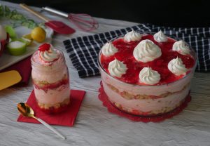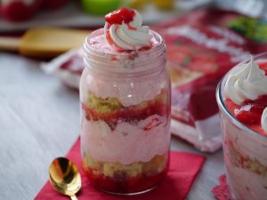 In a serving gar,add prepared strawberry jello,crumbled plain sponge cake,prepared strawberry cream, prepared strawberry jello,crumbled angel food cake or plain sponge cake,prepared strawberry cream & garnish with reserved whipped cream & strawberry jello.