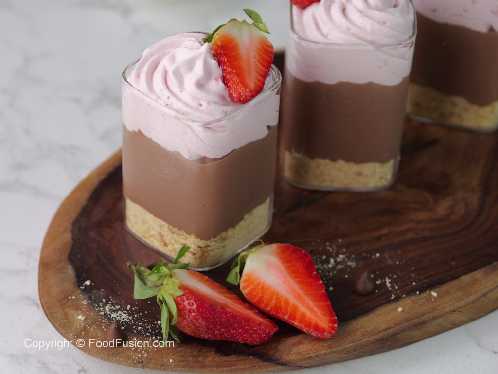 -Serving glass mein crushed biscuits,tayyar chocolate pudding & strawberry cream dal dein.
