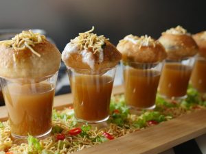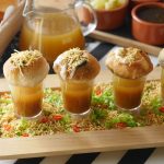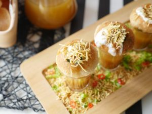 Poke gol gappa from the center,add chickpeas,potato & whole green gram,spicy green chutney,yogurt, prepared meethi chutney,sprinkle chaat masala,nimco sev & serve with prepared minty khatta pani!