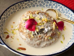 Garnish with almonds,pistachios,edible silver leaves & serve!