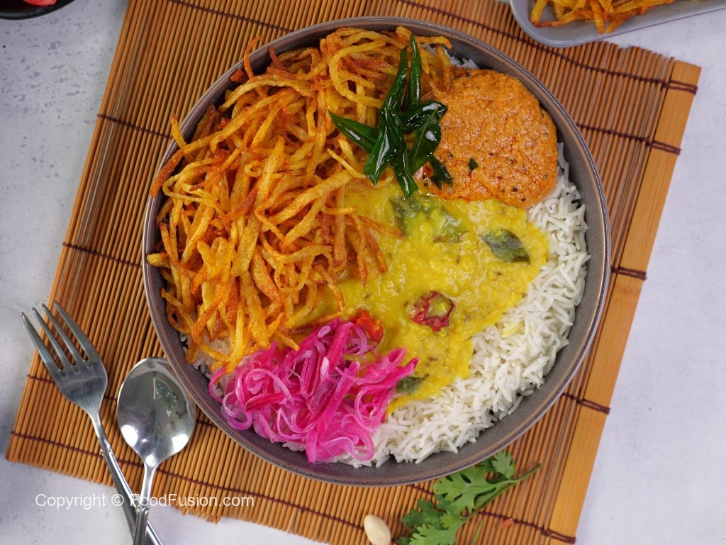 -Serving bowl mein rice, daal, crispy aloo, prepared teekhi chutney, pickle onion aur fried curry leaves dal kar serve karen.