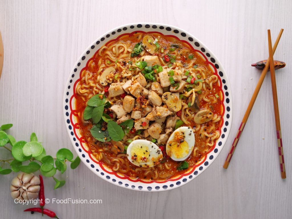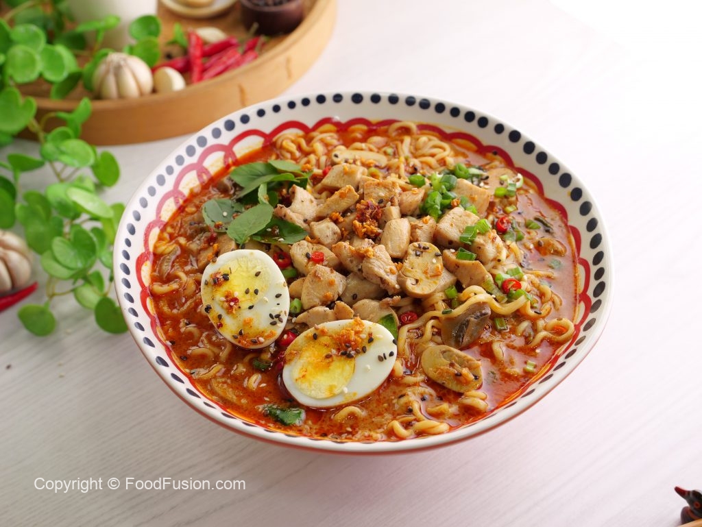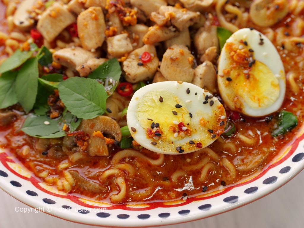 -Add cooked chicken,spring onion,thai red chilli,fresh basil leaves,boiled egg,chilli oil,sesame seeds & serve!