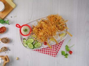 -Air fry in preheated air fryer at 200C, spray oil on thread chicken sticks & air fry for 10-12 minutes (flip in between).