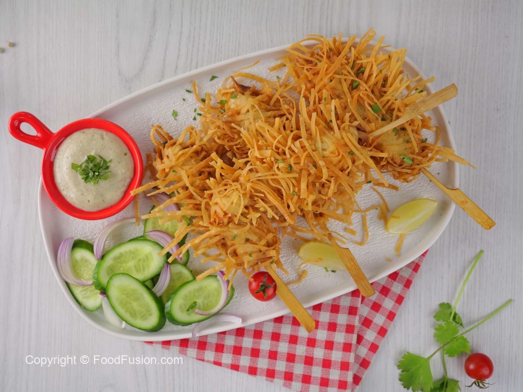 -In a wok, heat cooking oil (140 C) & deep fry skewers on low flame until golden & crispy (10-12 minutes).