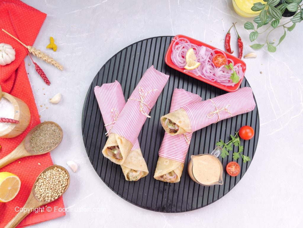 -Paratha per mayo sauce,cooked beef cubes,pyaz rings,hari chutney aur mayo sauce dal ker butter paper mein warp ker ka serve karein (makes 4-5).