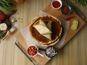 Lahmacun ko pyaz,tamatar,hara dhania aur lal mirch crushed ka saath serve karein!