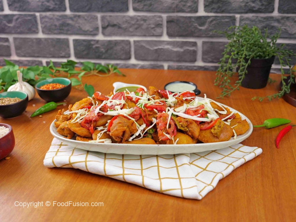 -In a serving platter, add fried pakoray, fried tomato & green chilli slices, pickle, garnish with cabbage & serve!