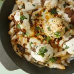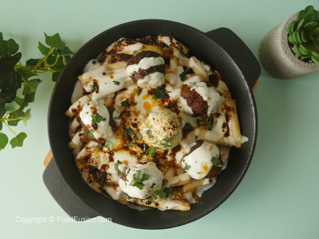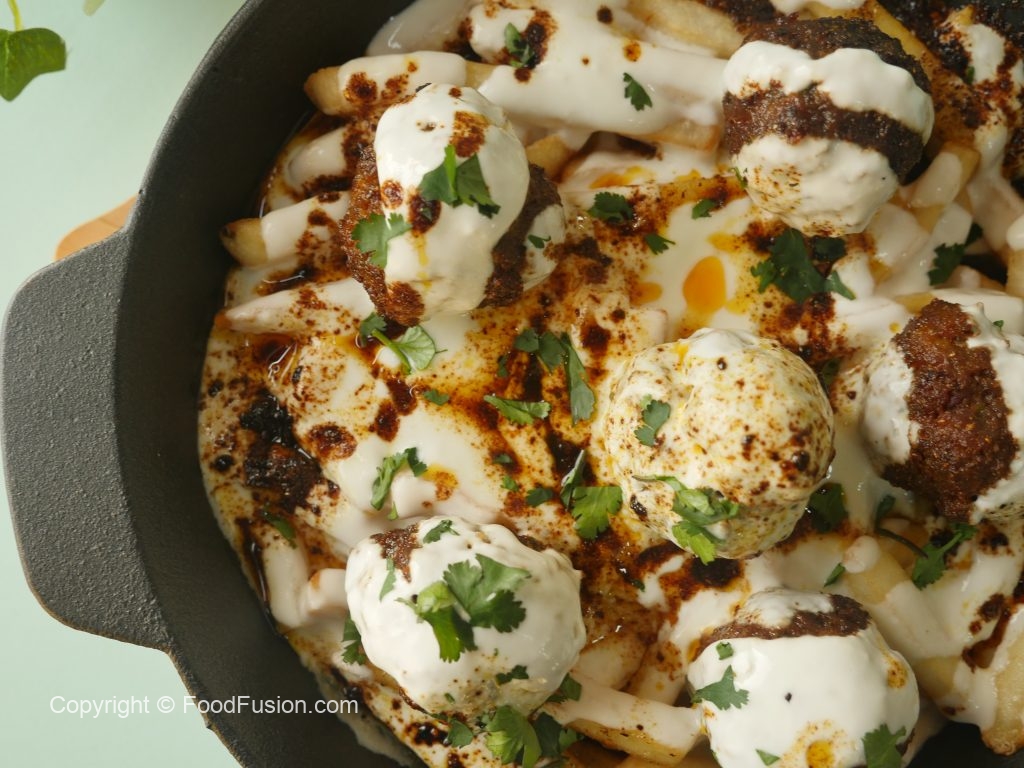 On serving dish,add potato fries,cooked meat balls,garlic yogurt,pour heated meatballs oil,fresh coriander & serve!