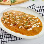 -In a serving platter add vegetable seekh kabab, pour gravy over kabab, garnish with cream & fresh coriander, serve with naan!