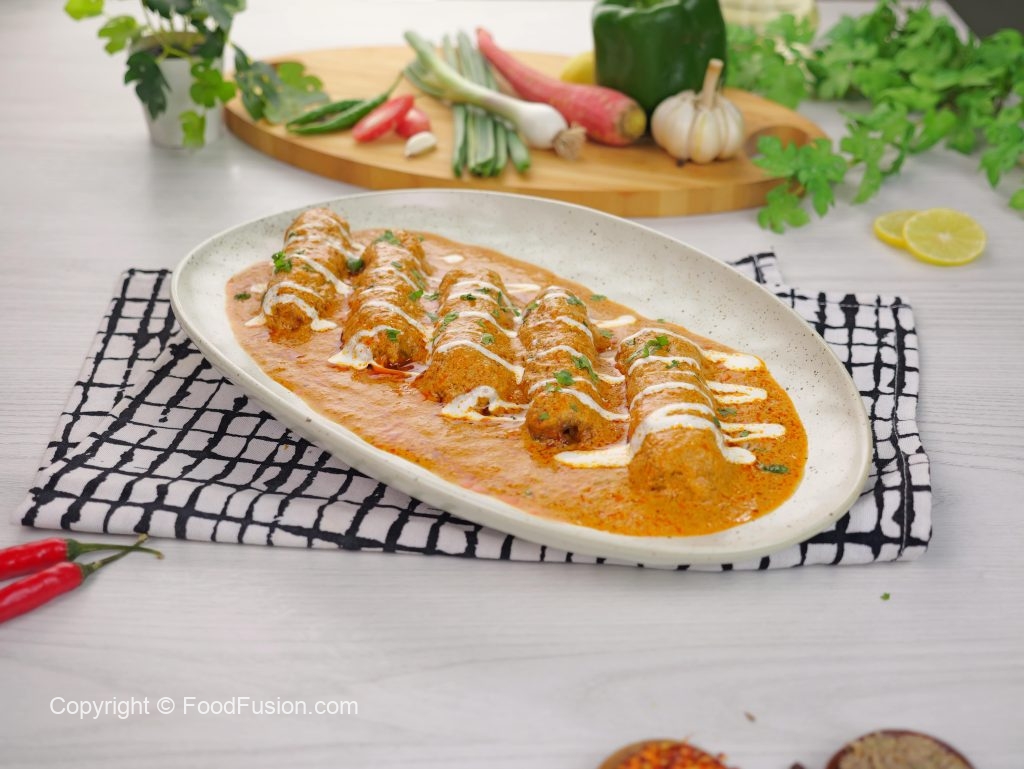 -Serving platter mein vegetable seekh kabab rakhain, upar se gravy dalein, cream aur hara dhania se garnish karen aur naan ke sath serve karen!