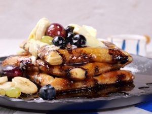 -Waffles per cheeni aur chocolate syrup dal dein.