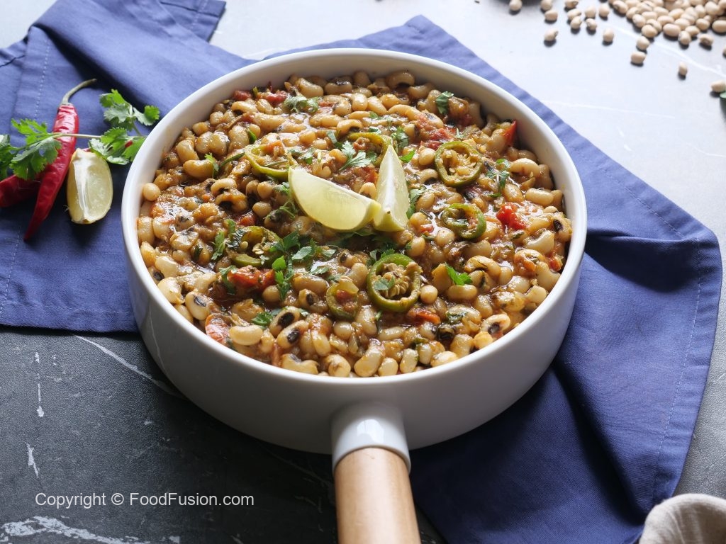 -In a pressure cooker,add black eyed beans,salt,water & mix well,cover & pressure cook for 12-15 minutes then strain & set aside.