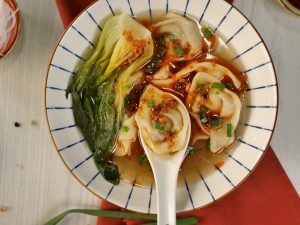 -In a bowl,add glass noodles,prepared wonton soup,bok choy,chilli oil,spring onion leaves & serve!